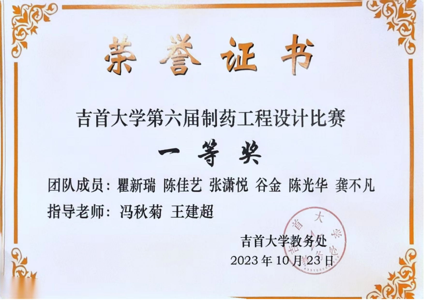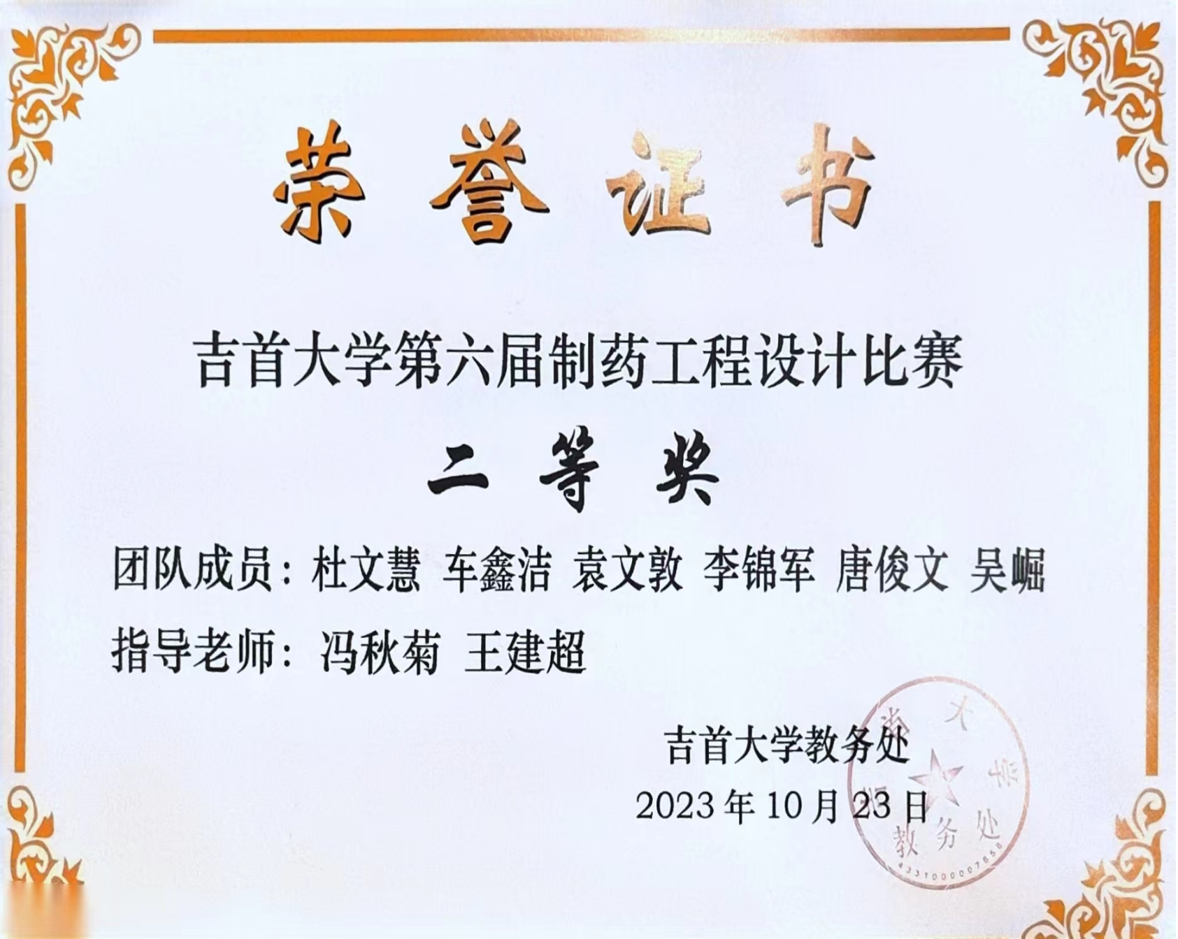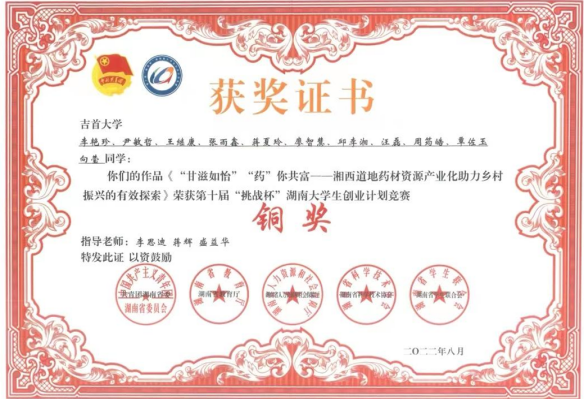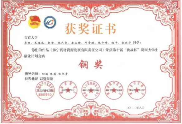 2022年:第十届挑战杯湖南省老员工创业计划竞赛铜奖、第十届全国老员工制药工程设计竞赛二等奖