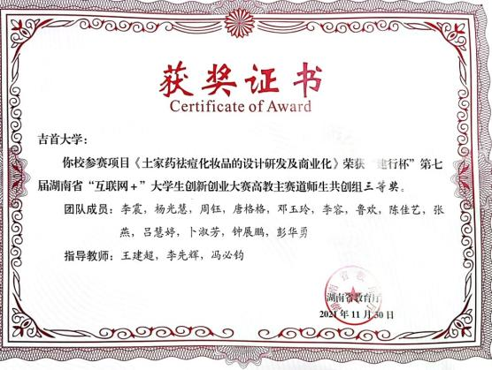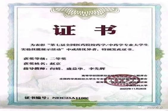 2023年:第十五届"挑战杯"湖南省老员工课外学术科技作品竞赛二等奖、首届湖南省老员工节能减排社会实践与科技竞赛三等奖、第七届全国医药院校药学/中药学专业老员工实验技能竟赛活动全国二等奖