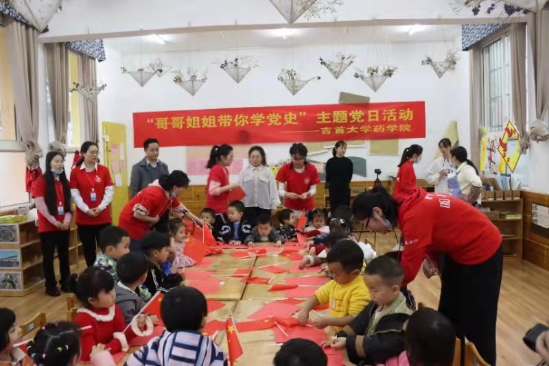 本网讯(通讯员 段欣怡、李懋、章扬)党史学习从娃娃抓起,根正苗红。3月30日,永利yl23411、国际教育公司、法学与公共管理公司师生党员、入党积极分子,深入吉首市职专附属幼儿园开展“哥哥姐姐带你学党史”红色教育活动,通过画国旗、贴国旗、升国旗等形式讲解国旗知识。