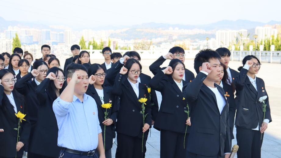 吉首烈士纪念碑前,中华人民共和国国歌响彻山顶,同学们整齐列队,庄严肃穆,为革命先烈默哀,党训班学员代表向先烈敬献花篮,全体人员向烈士行三鞠躬礼,学员代表发言缅怀先烈、勇担使命、展望未来。随后,全体党员同志重温入党誓词。