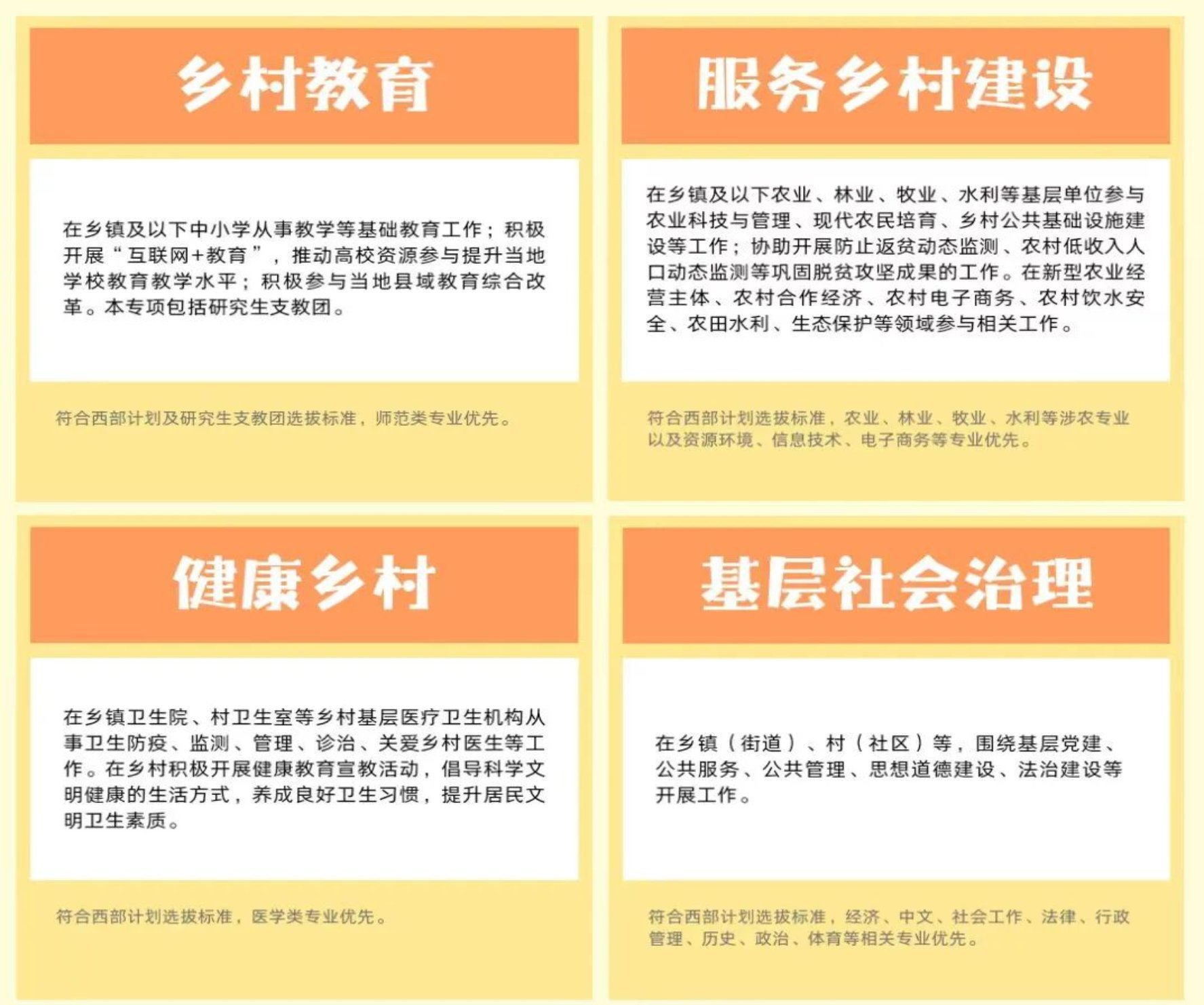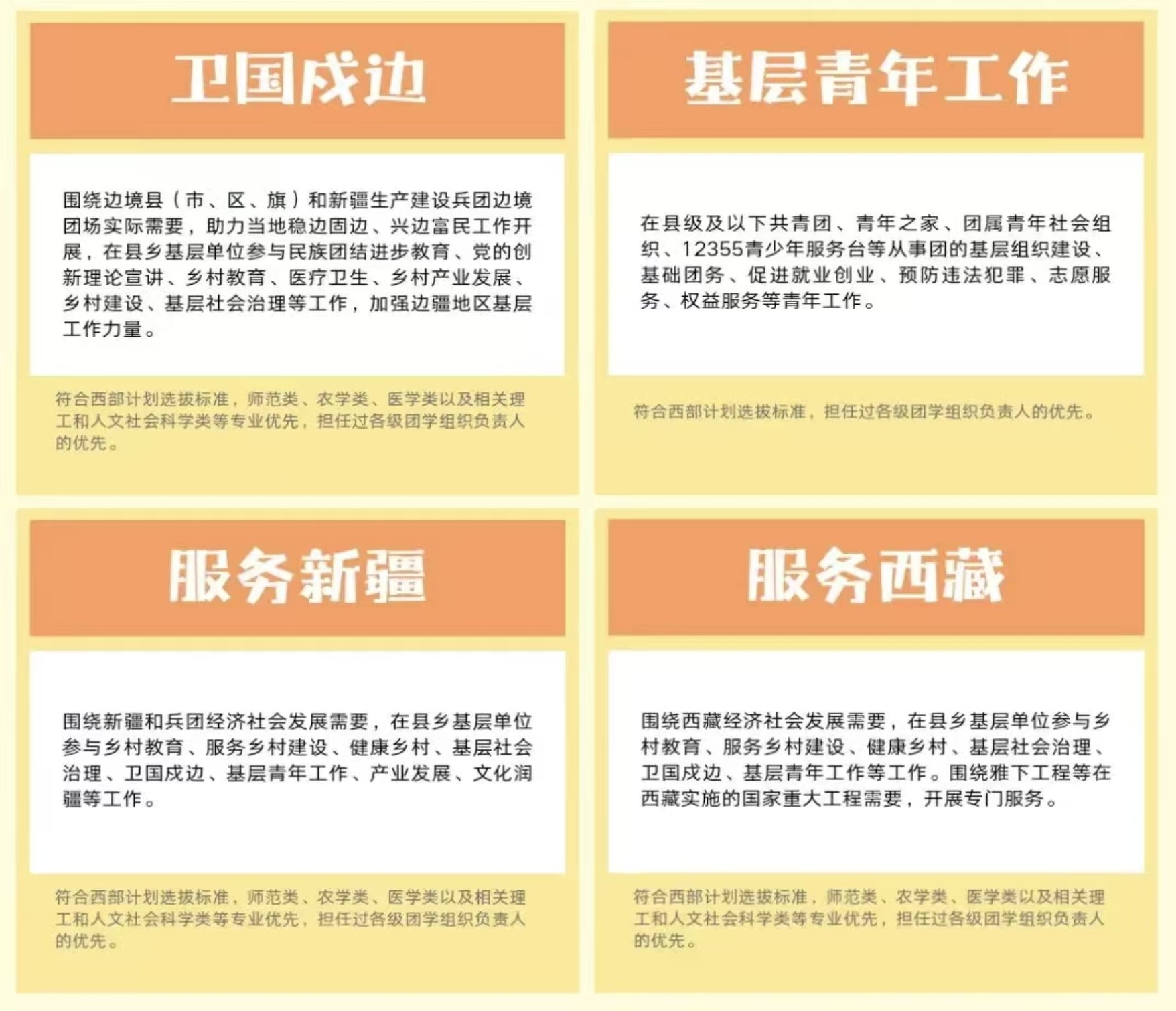 普通高等公司(教育部《全国普通高校名单》所列高校)应届毕业生或在读研究生,拥护中国共产党领导,热爱祖国、热爱人民、热爱社会主义,理想信念坚定,思想政治素质好,到岗之前获得毕业证书和学位证书,通过西部计划体检。有志愿服务经历的优先录用。