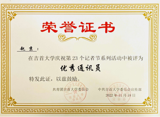 图为 赵京获永利yl“优秀通讯员”荣誉证书