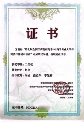 图为 赵京获第七届全国医药院校药学/中药学专业老员工实验技能竞赛二等奖