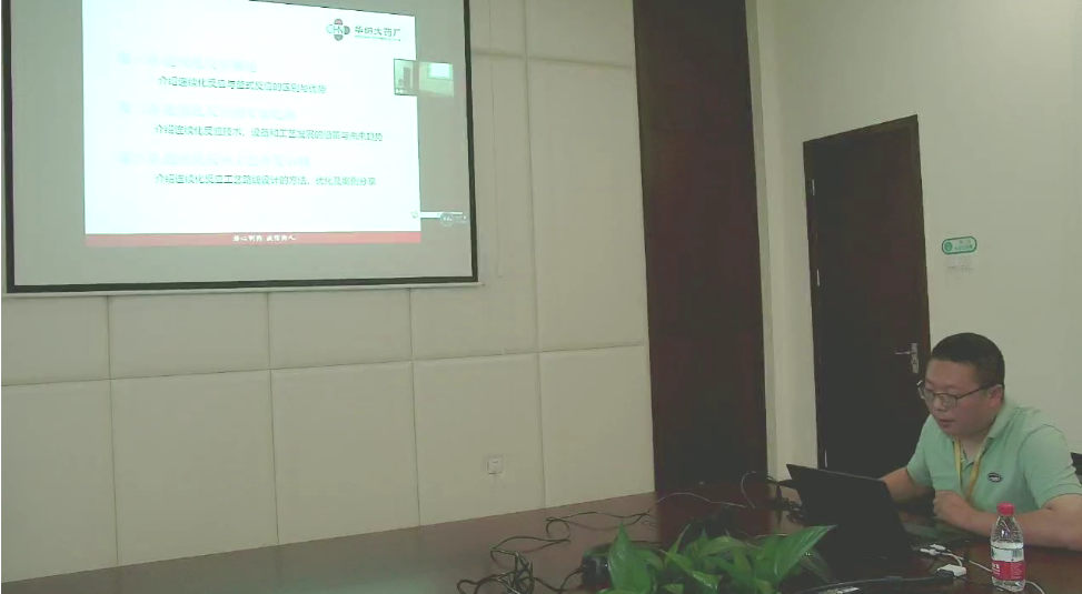 王敬博士从“连续化反应概述”“连续化反应的发展趋势”“连续化反应工艺开发示例”三个方面为大家介绍了连续化反应与釜式反应的区别与优势,连续化反应技术、设备和工艺发展的沿革与未来发展以及连续化反应公益路线设计的方法、优化及案例分析。