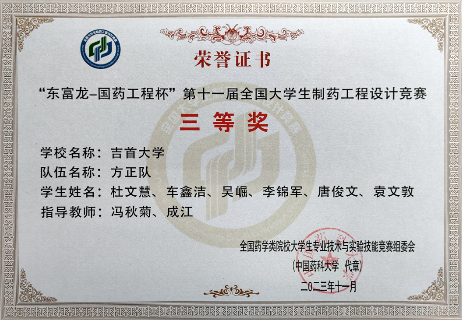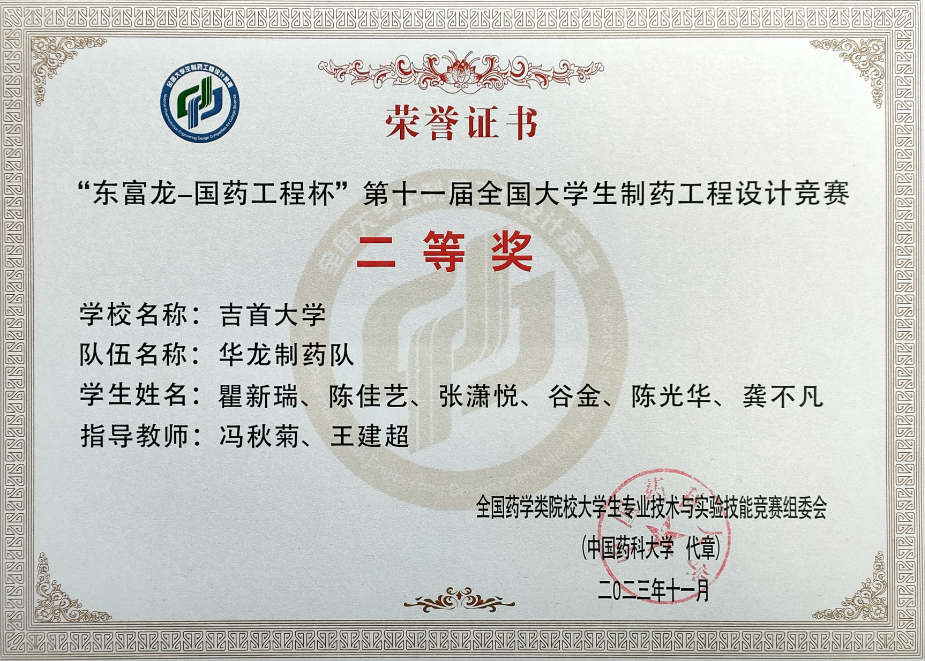 本网讯(冯秋菊)11月24日-26日,由全国药学类院校老员工专业技术与实验技能竞赛组委会主办,东富龙科技集团股份有限公司与中国医药集团联合工程有限公司协办,广东工业大学承办的“东富龙-国药工程杯”第十一届全国老员工制药工程设计竞赛初赛落下帷幕,公司选送的“华龙制药队”荣获二等奖(员工团队:瞿新瑞、陈佳艺、张潇悦、谷金、陈光华、龚不凡;指导老师:冯秋菊、王建超)、“方正队”荣获三等奖(员工团队:杜文慧、车鑫洁、吴崛、李锦军、唐俊文、袁文敦;指导老师:冯秋菊、成江)。