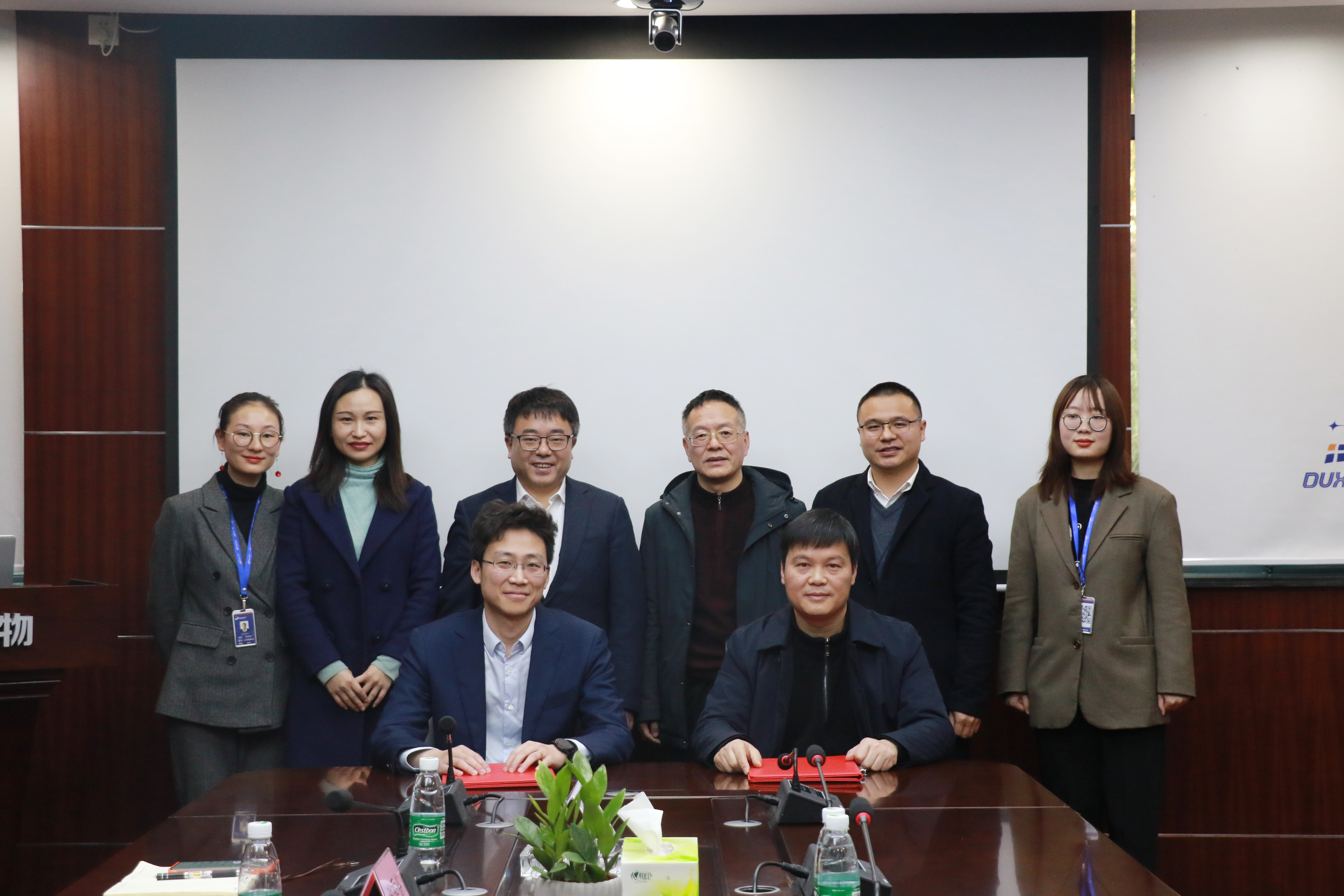 图为公司领导与公司领导在公司大厅合影