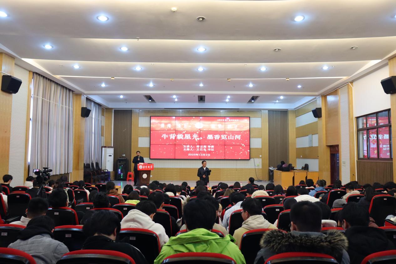 本网讯(通讯员 袁鑫雨 刘张井)12月2日下午,永利yl23411“药好青春”立人教育讲座第33期在大田湾校区第二教学楼2609报告厅举行。央视《特别关注》总导演、制片人,香港文联作协副主席符云亮应邀回母校,以“牛背载星光 墨香揽山河——湘西放牛娃的央视逆袭诗行”为题,讲述从放牛娃到央视导演的成长故事。讲座由王江生主持。