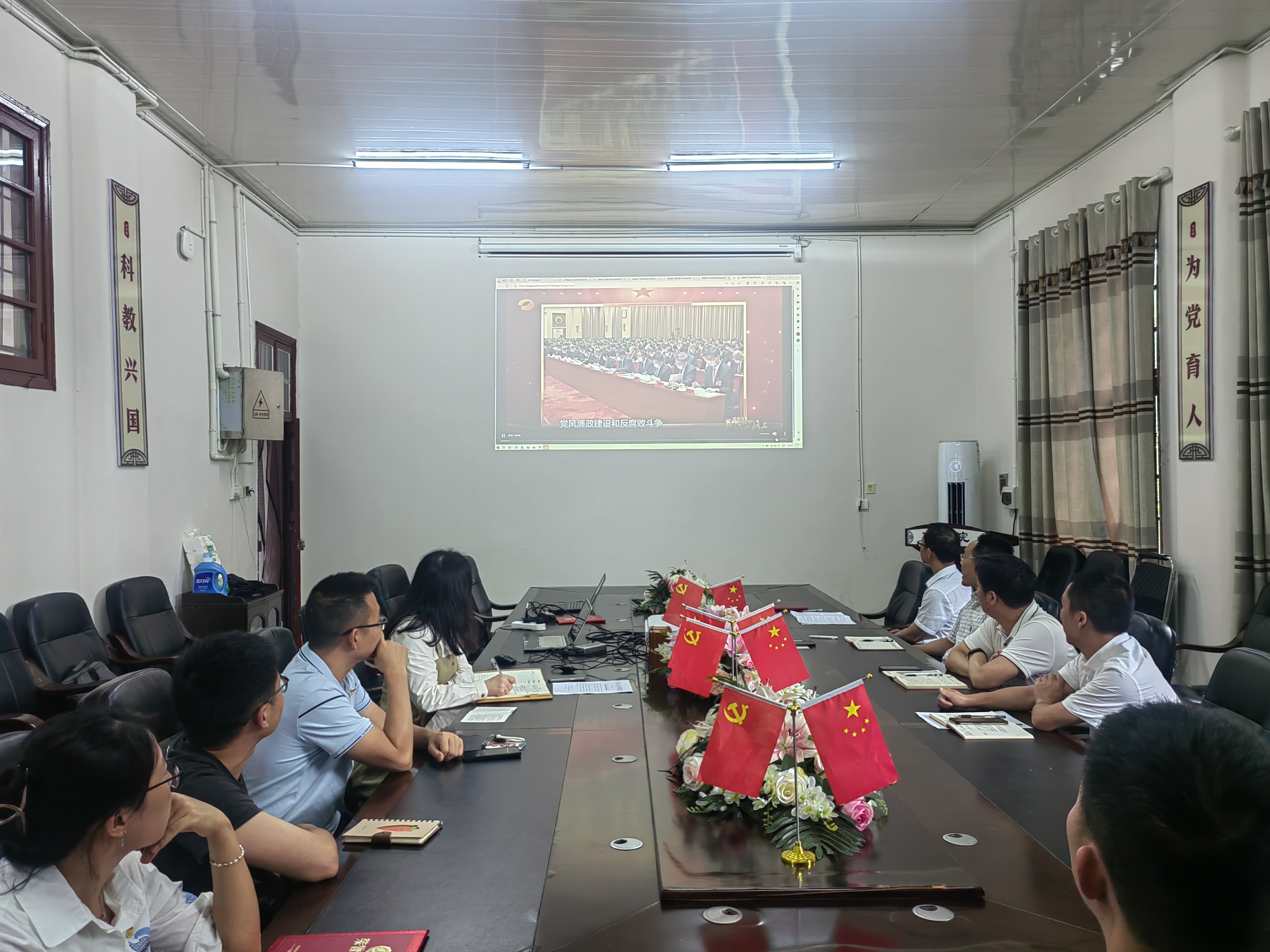 图为 教工党员集中观看警示宣传片。