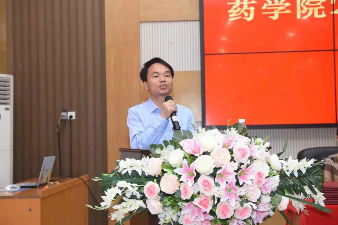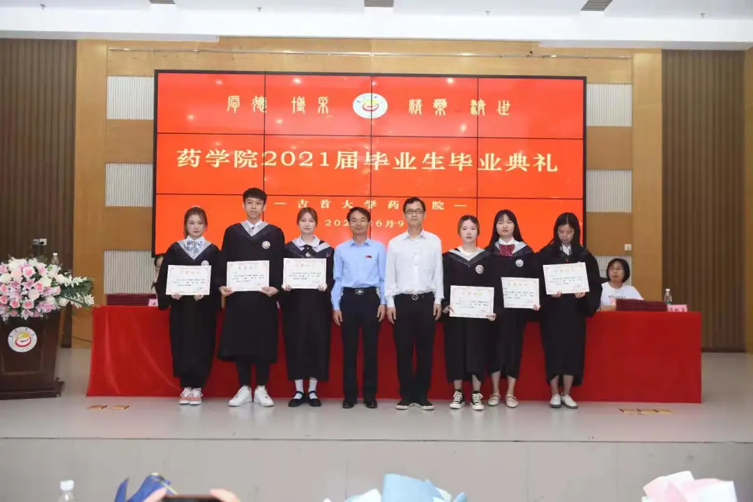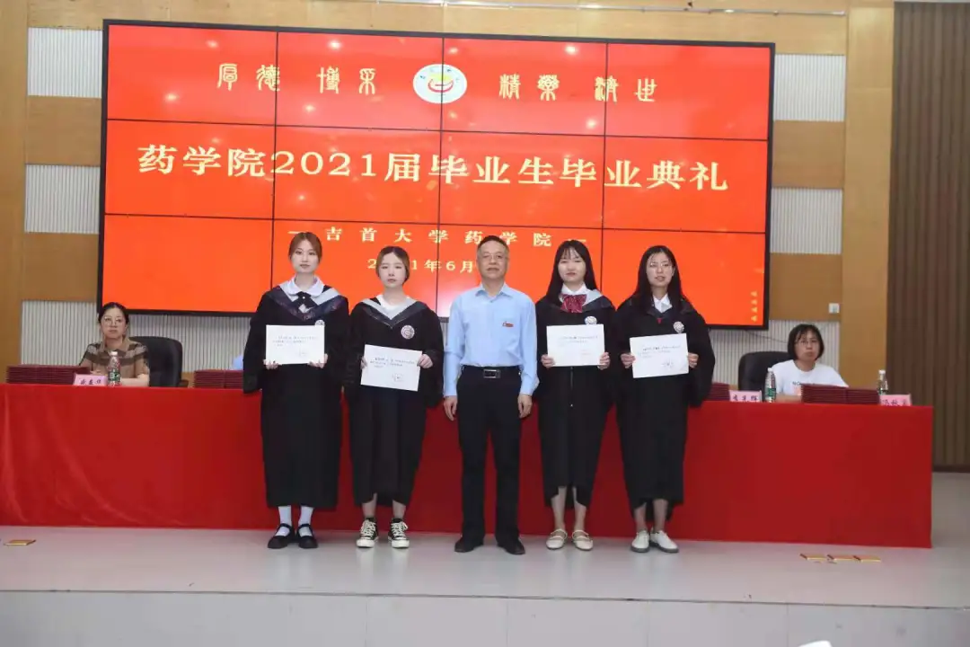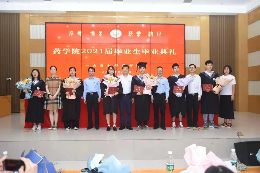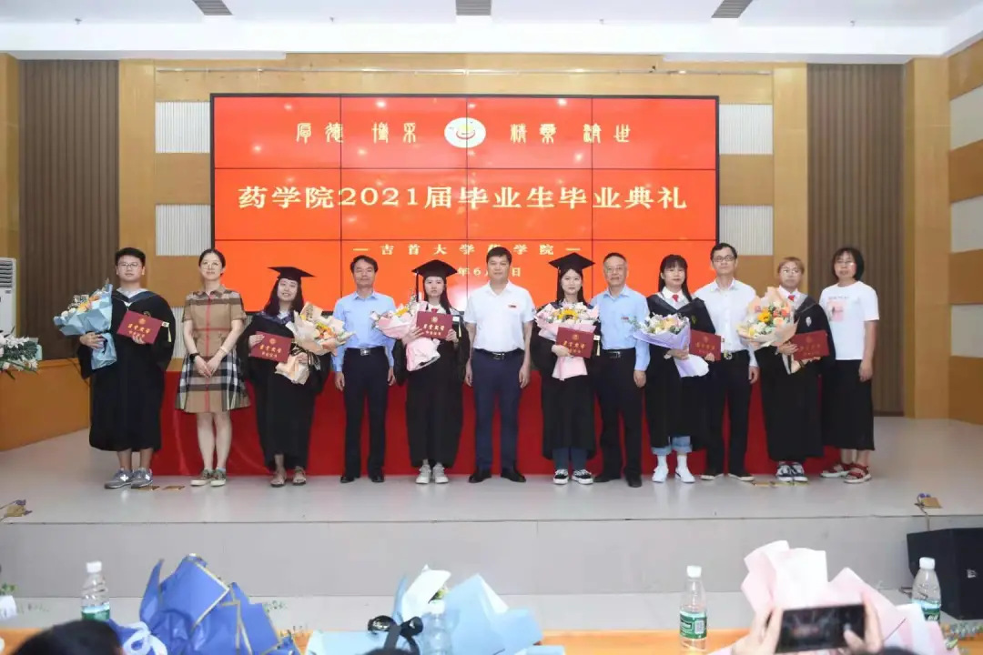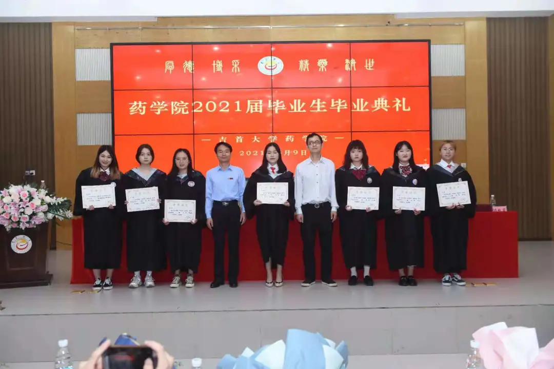 副经理李先辉教授宣读毕业证、学位证授予文件。公司领导、老师逐个为毕业生颁发毕业证书,送上鲜花和精心准备的印有院训“厚德 博采 精药 济世”的毕业纪念礼物--金色书签,并合影留念。