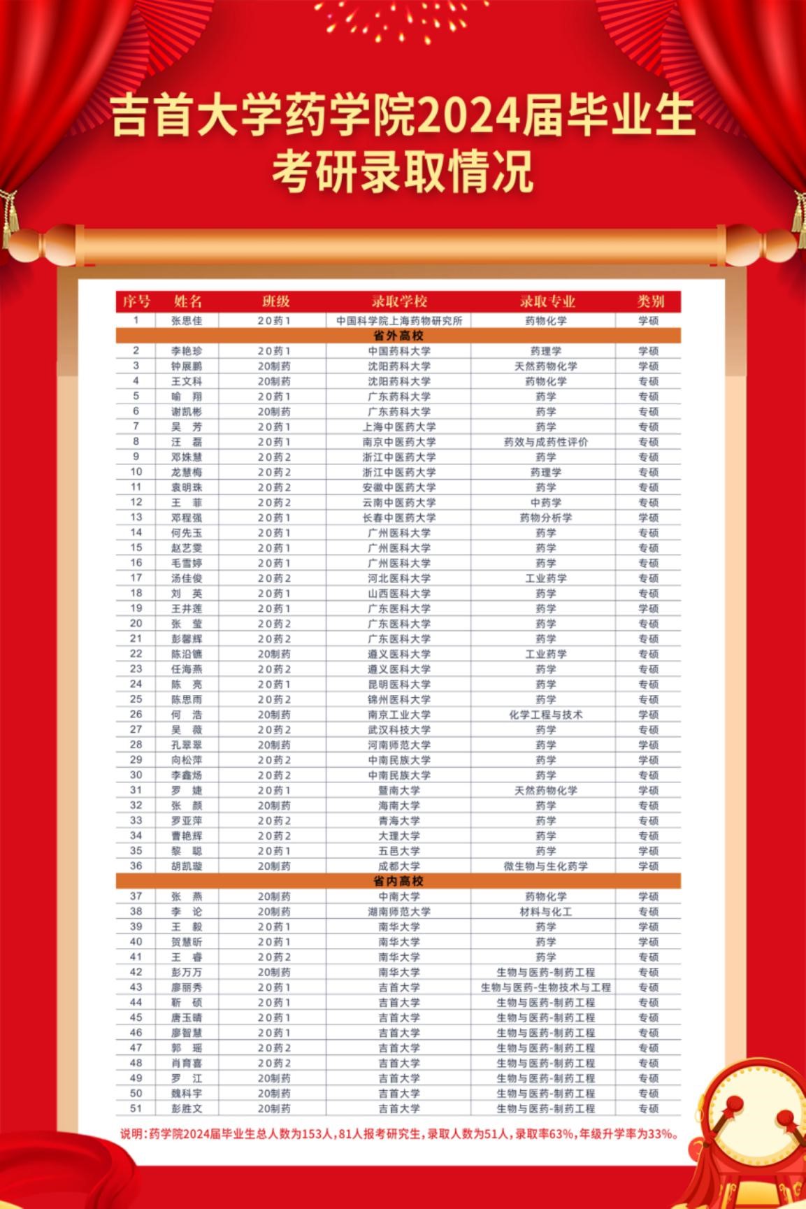 永利yl234112024届本科生153人,81人报考,录取51人,录取率为63%,年级升学率为33%,相比2023届,升学率增长了10.6%。这一喜人的成绩充分展现了永利yl23411学子刻苦学习、勇攀高峰、坚持不懈的精神。