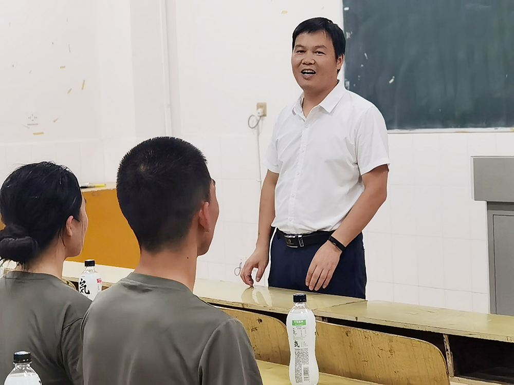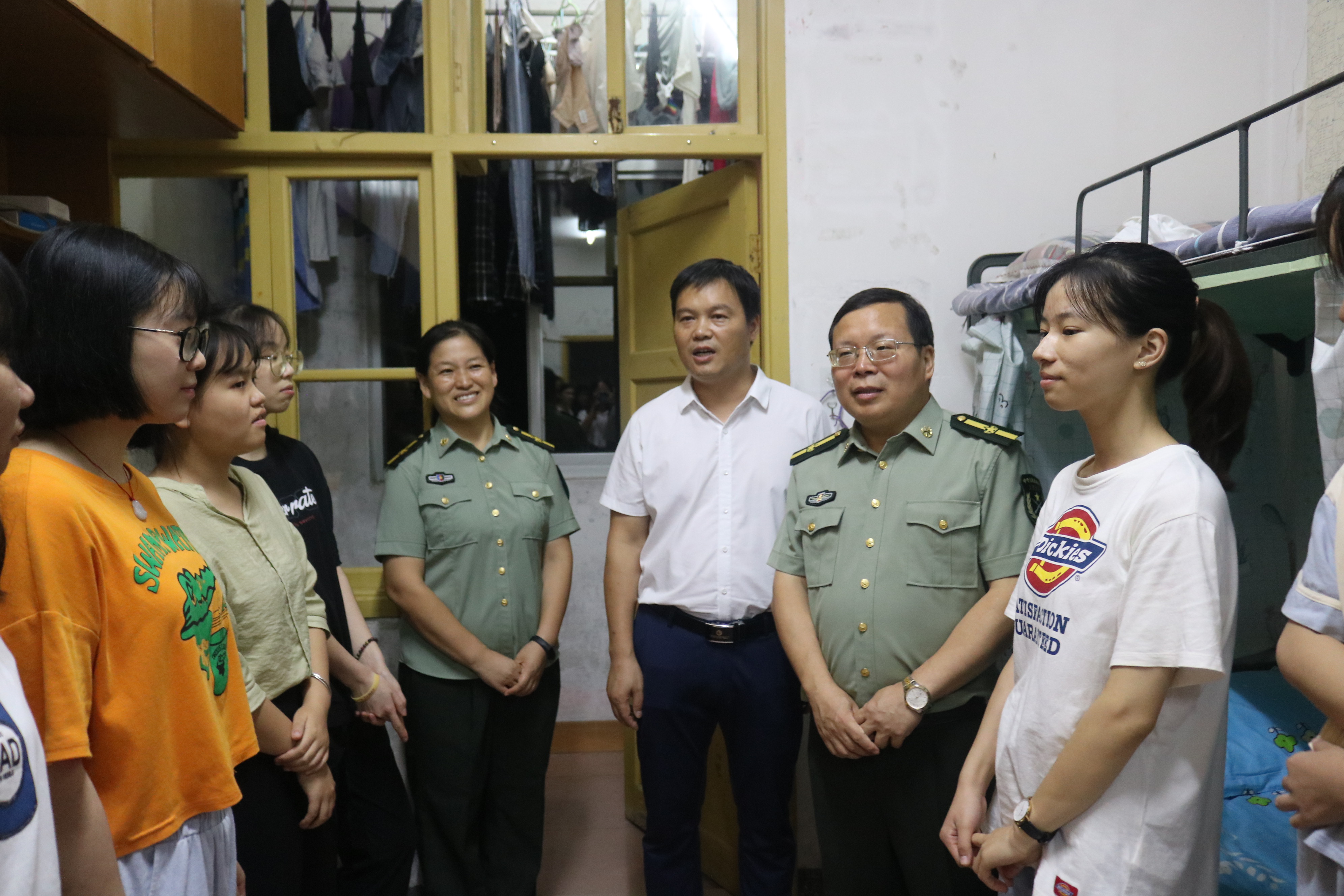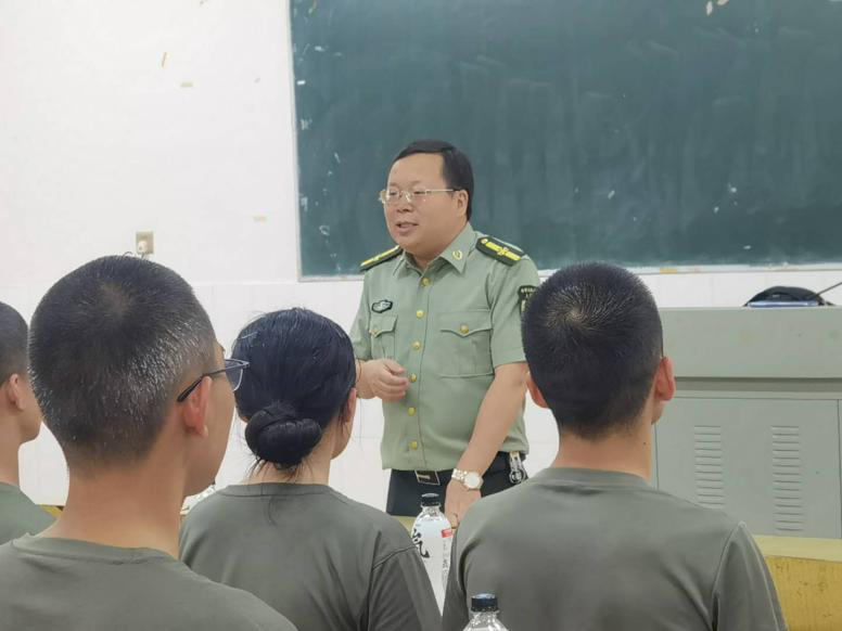 在看望集训教官时,李洪雄老师表达了亲切慰问,进行了热情洋溢的讲话,并希望军训教官要“文明训练、科学训练、严格训练、安全训练”,王江生老师说“教官是新生入学的第一个老师,一定要以身作则,为新生做好表率”。
