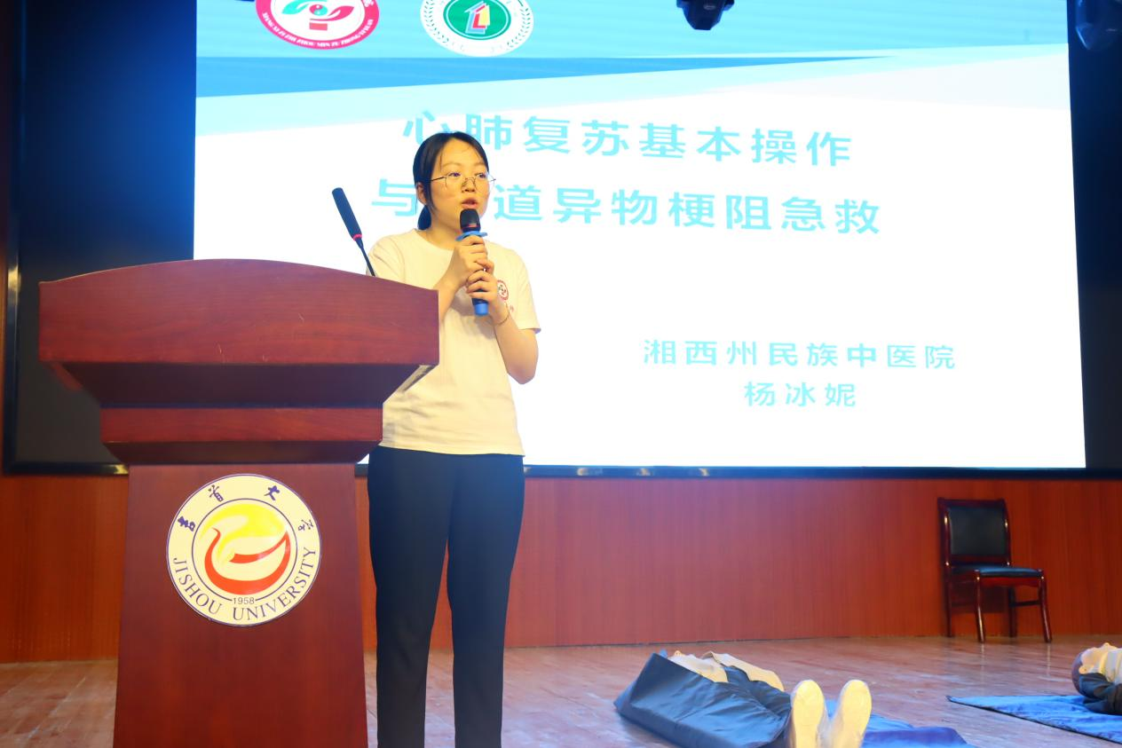 随后,湘西州民族中医院院感科医师、现场救护第一目击者培训导师杨冰妮运用丰富的专业知识和生动形象的课件模型,阐明了“现场救护——第一目击者”的重要性,并讲解了救护新概念、心肺复苏法的实施方法与步骤、AED体外自动除颤机的使用方法、气道异物梗阻急救、外伤急救简易的创伤处理及安全搬运等理论知识。