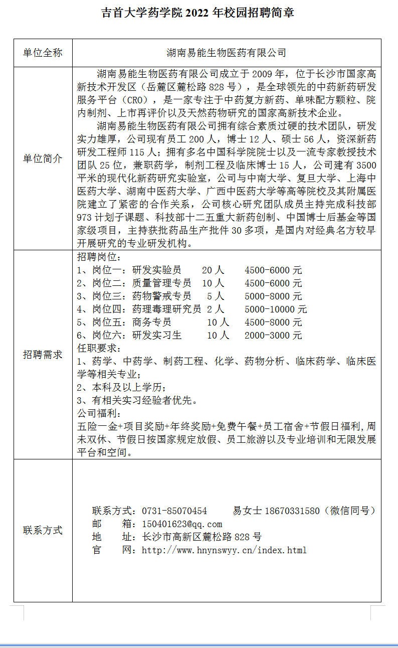 2022年实习就业招聘||湖南易能生物医药有限公司招聘简章
