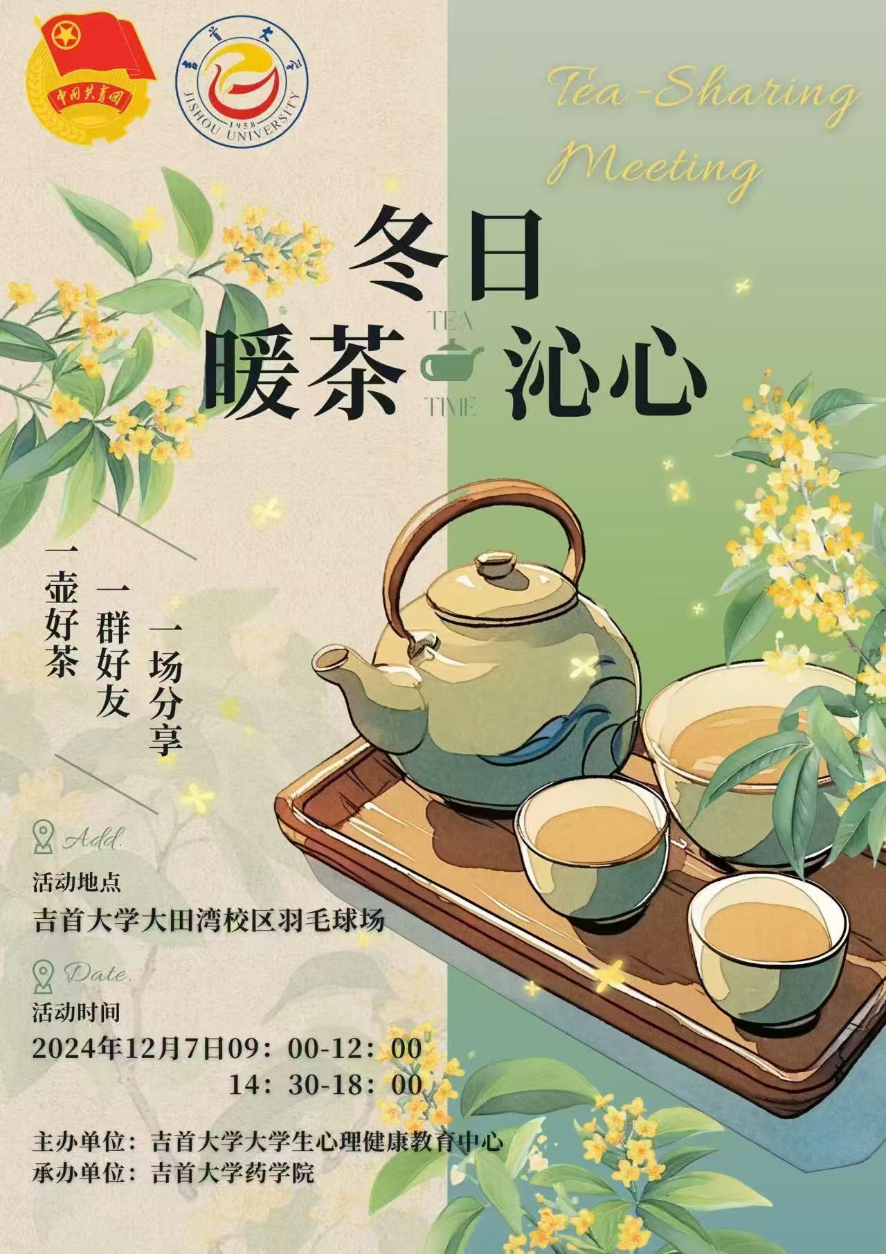 无论你是活泼的“显眼包”,还是内敛的倾听者,这里都有你的快乐天地。一起解决烦恼,憧憬未来,在2024年12月7日的永利yl大田湾校区的羽毛球场,让暖茶沁润你的心灵。快来共赴这场冬日茶话会之约吧!