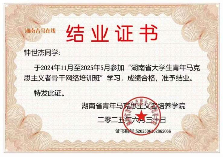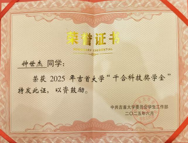 图为 钟世杰获奖证书