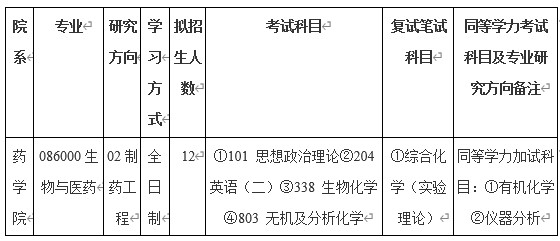 公共课、专业基础课和专业方向课程为学位课。其中,公共课程为英语、自然辩证法概论、科学社会主义理论与实践、工程伦理四门课程;专业基础学位课程包括文献综述与科技论文写作、现代仪器分析、实验设计与数据处理、专业英语、高级生物化学等五门课程;设置专业方向课程,由员工根据研究方向进行选修;设置专业选修课程,由员工根据拟研究课题进行选修;实践环节为专业实践。跨专业和同等学历的研究生应补修本科阶段的主要课程,要求通过考核,取得及格成绩,但不计学分。核心课程为高级生物化学、药品生产质量管理工程、药物制剂工艺与技术、制药工艺与技术。