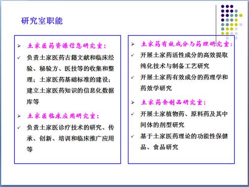 目前,研究中心正开展传统土家医药古籍文献和临床经验、秘验方、医技的收集和整理,建立土家医药知识信息化数据库;开展特色土家医诊疗技术标准(土家医麝针疗法、土家医推油火疗法、土家医烧艾疗法、土家医放痧疗法、土家医扯罐疗法等)的制修订、培训和临床推广应用;开展土家药用植物白头婆、牛王刺和抱石莲等活性化合物的分离、制备及药理药效研究;开展治疗骨质疏松和关节炎等病的功能性保健品研发以及抗艾滋病土家药的研发等。